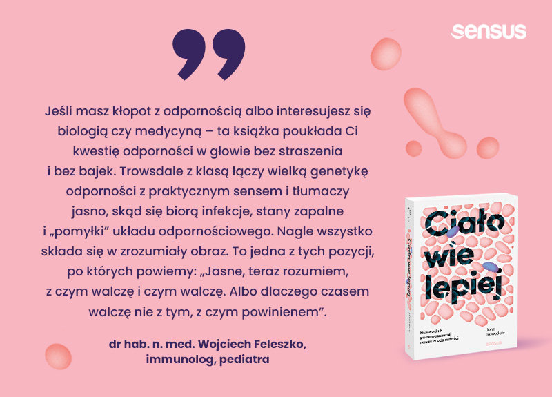 Jeśli masz kłopot z odpornością albo interesujesz się biologią czy medycyną ― ta książka poukłada Ci kwestię odporności w głowie bez straszenia i bez bajek. Trowsdale z klasą łączy wielką genetykę odporności z praktycznym sensem i tłumaczy jasno, skąd się biorą infekcje, stany zapalne i "pomyłki" układu odpornościowego. Nagle wszystko składa się w zrozumiały obraz. To jedna z tych pozycji, po których powiemy: "Jasne, teraz rozumiem, z czym walczę i czym walczę. Albo dlaczego czasem walczę nie z tym, z czym powinienem".