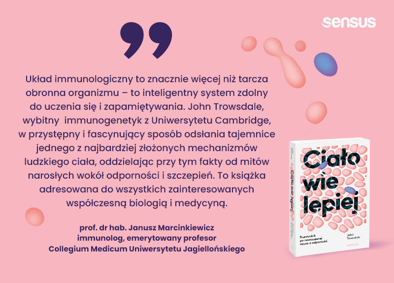 Odporność, układ immunologiczny i szczepienia ochronne od czasu pandemii COVID-19 stanowią stały element debat publicystycznych i internetowych dyskusji. Niestety, ze względu na niezwykłą złożoność funkcjonowania układu odpornościowego, a także częsty brak rzetelnej wiedzy narosło wokół niego wiele mitów i błędnych interpretacji. Układ immunologiczny to nie tylko mechanizm obronny organizmu, lecz również inteligentny system zdolny do uczenia się i zapamiętywania przebytych zdarzeń ― cecha, którą zwykle przypisujemy wyłącznie ludzkiemu mózgowi. W swojej książce John Trowsdale, wybitny immunogenetyk, odsłania przed czytelnikiem tajemnice jednego z najbardziej złożonych układów w ludzkim ciele. Opisywane odkrycia często zdumiewają. Autor wyjaśnia między innymi, w jaki sposób układ immunologiczny potrafi odróżniać struktury własne od obcych i eliminować te niepożądane lub groźne. Fascynujące jest również to, jak niewielka grupa genów jest w stanie wygenerować miliardy różnorodnych przeciwciał ― białek zdolnych do rozpoznania praktycznie każdego patogenu. Napisana w sposób przystępny, a zarazem intrygujący, pozwala lepiej zrozumieć mechanizmy rządzące odpornością. Książka jest adresowana nie tylko do medyków i biologów, lecz także do wszystkich, którzy interesują się wiedzą opartą na faktach.